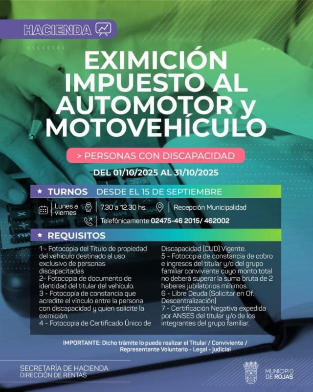 11 | 09 | 2025 | Del 1 al 31 de octubre estarán abiertas las solicitudes de eximición de tributos para personas con discapacidad, jubilados y pensionados. También se incluye el beneficio para automotores y motovehículos de uso exclusivo de personas con discapacidad....