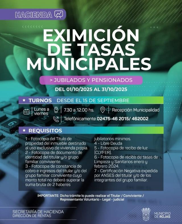Desde la Secretaría de Hacienda del Municipio de Rojas informaron que se encuentra abierta la inscripción para acceder a los beneficios de eximición de tasas municipales e impuestos correspondientes al período 2025. El trámite podrá realizarse entre el 1º y el 31 de octubre, con turnos que pueden solicitarse desde el 15 de septiembre en la recepción del Palacio Municipal o comunicándose al 02475-46 2015 / 462002.